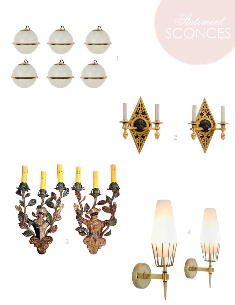 1 – 50s Italian Arteluce sconces (a pair would be everything over a bathroom vanity) / 2 – French bronze and ormolu lion head sconces (for a serious note) / 3 – Italian antique sconces (there is no substitute for real patina) / 4Arrodeluce attributed sconces (for some Palm Springs swagger a la David Jimenez)